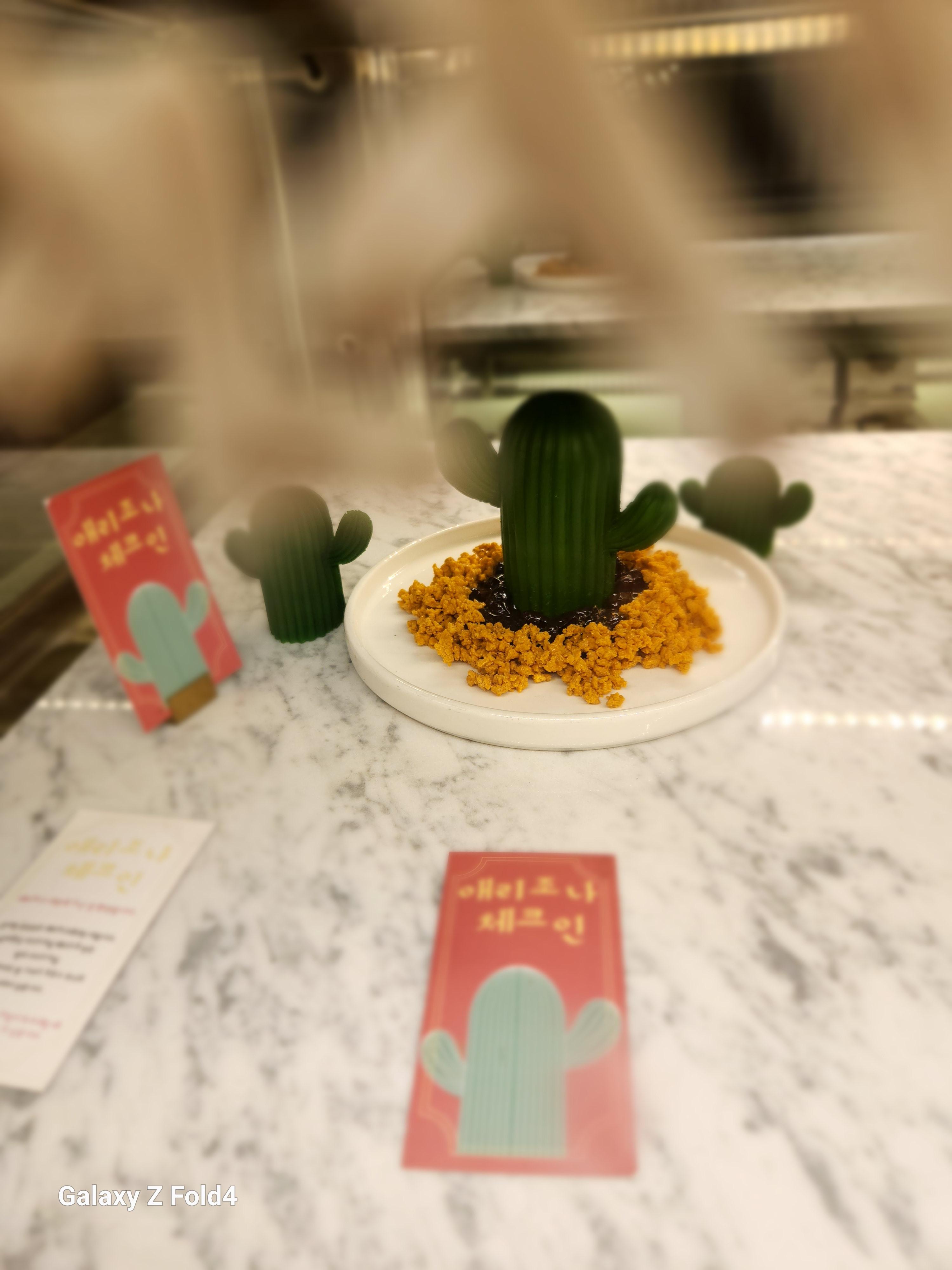 • 애리조나 체크인: 선인장 모양 말차 디저트. 팥+쿠키와 함께 제공